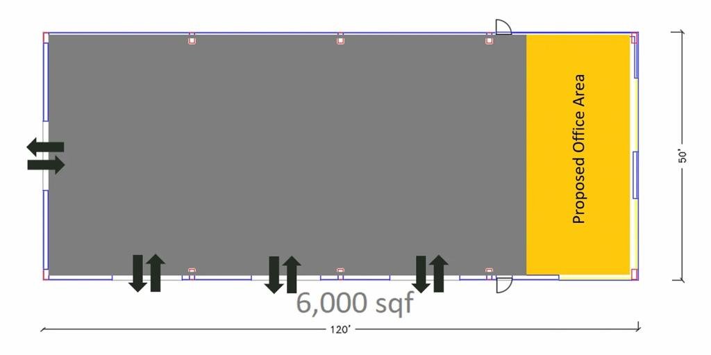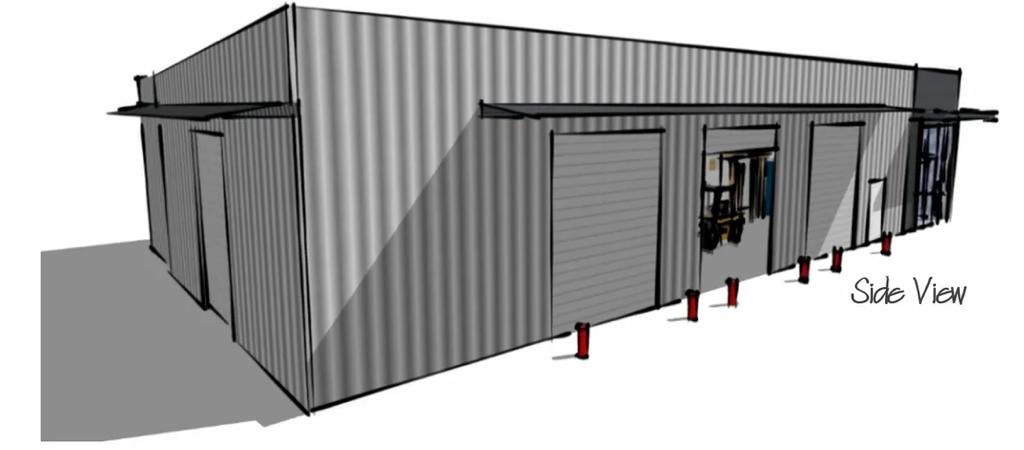 On the long facade, three oversized grade level doors are proposed for a better flow of works in and out of the warehouse, and via the adjacent driveway. On the back façade one industrial grade level doors is proposed to help rear side movement.